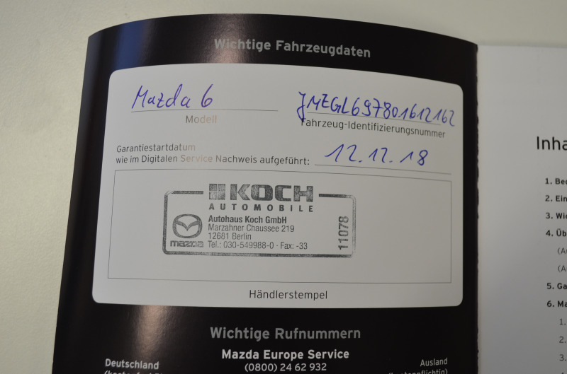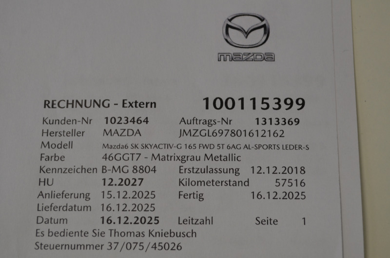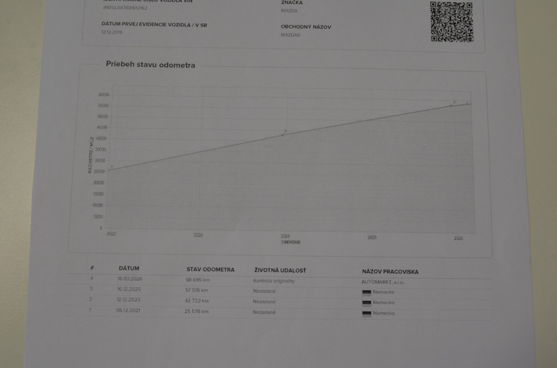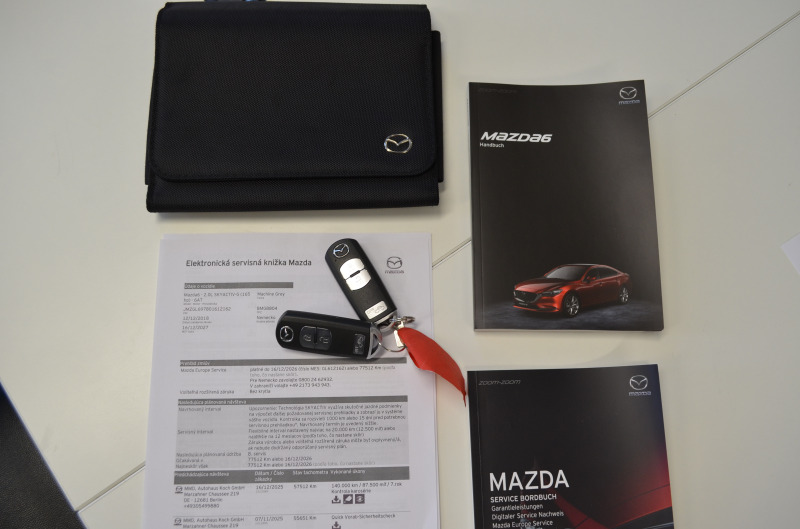 Pravidelný servis MAZDA s kompletnou servisnou históriou na VIN čísle + vytlačená v papierovej forme. Všetky servisy prevedené len v autorizovanom servise s kompletnou dokumentáciou. Auto je dovezené z Nemecka od súkromnej osoby (žiadne firemné auto, bolo servisované len v Mazda servis - km a históriu si môžete preveriť kdekoľvek v servise Mazda). Garážovaný stav, úplne maximálne zachovalé interiér aj exteriér. Po pedantnom majiteľovi v Nemecku. Na aute nebola žiadna vážna nehoda. V prípade záujmu pomôžeme s prihlásením na SK značky. Poplatok za kompletné prihlásenie na slovenské značky je 600,00 Eur s novou STK+EK a KO. Seriózna ponuka. Originál km s digitálnou históriou + pri kúpe dostanete certifikát pravosti km - ODO-Pass + pôvodné protokoly z nemeckého servisu doložené. Nový deklarovaný servis v Mazde pri 57.512 km (16.12.2025) - nový olej servis + filtre a výstupná kontrola v celkovej hodnote: 622 Euro - auto je po novom servise. Platné asistenčné služby Mazda Europa Servis v celej EU. Dovážame len seriózne vozidlá vo vysokých výbavách s pôvodnými km od prvých majiteľov. Servisná história a všetky kľúče od vozidla a palubná literatúra. *** Produkt Datum: 12.12.2018 *** Veľmi zachovalý kus pre fanúšikov tejto japonskej značky v super výbave. Mazda 6 (generácia GJ/GL) patrí medzi najspoľahlivejšie autá strednej triedy za poslednú dekádu. Japonci stavili na jednoduchosť (žiadne turbo + rozvodová reťaz), čo robí z tohto modelu "držiak".